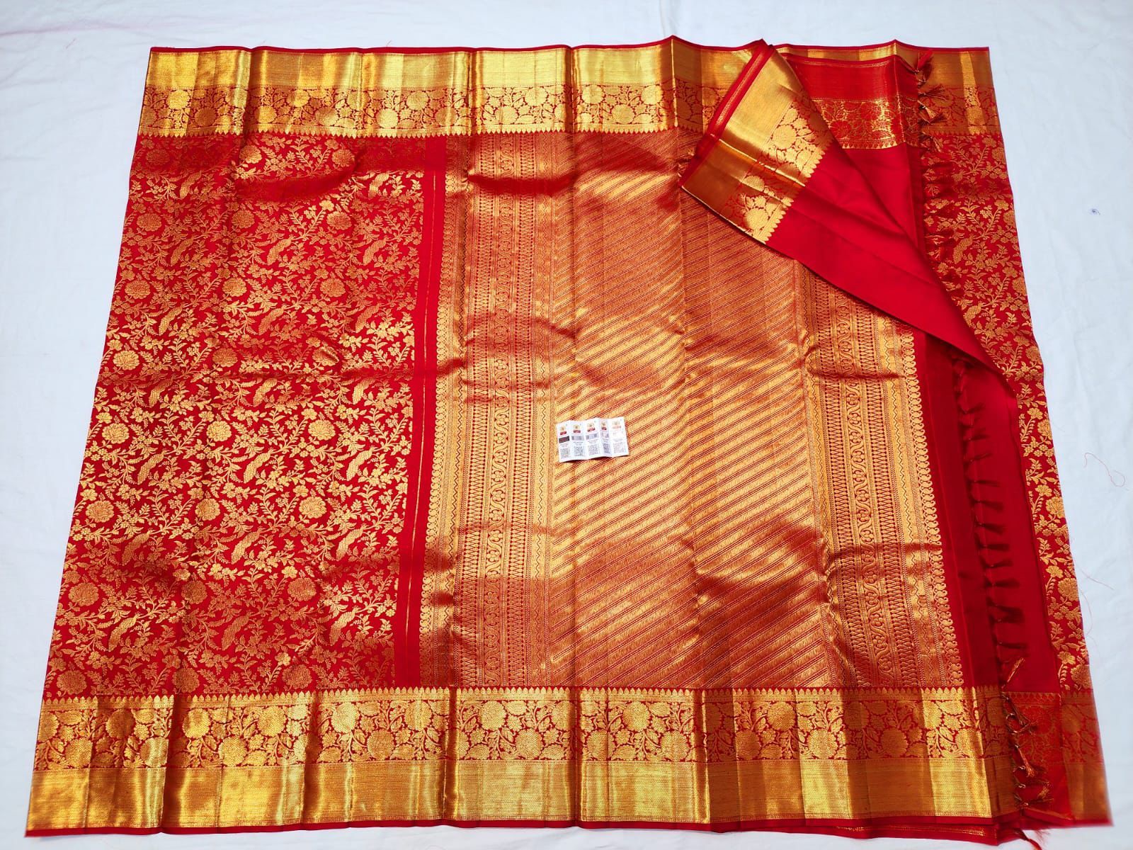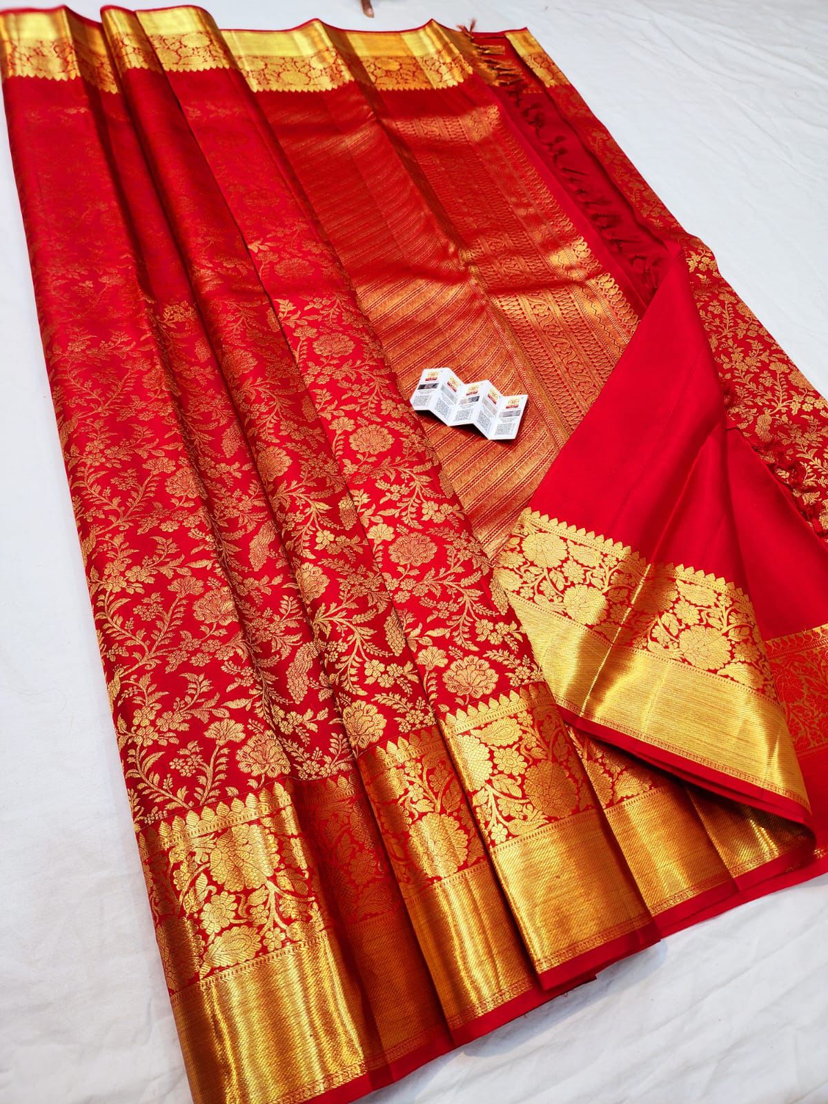 The deep red hue, paired with intricately woven temple borders and a lavish pallu, creates a regal silhouette ideal for weddings and sacred ceremonies. Known for its durability, luxurious texture, and graceful drape, this Kanchipuram silk saree is designed to be treasured as a bridal heirloom for generations.