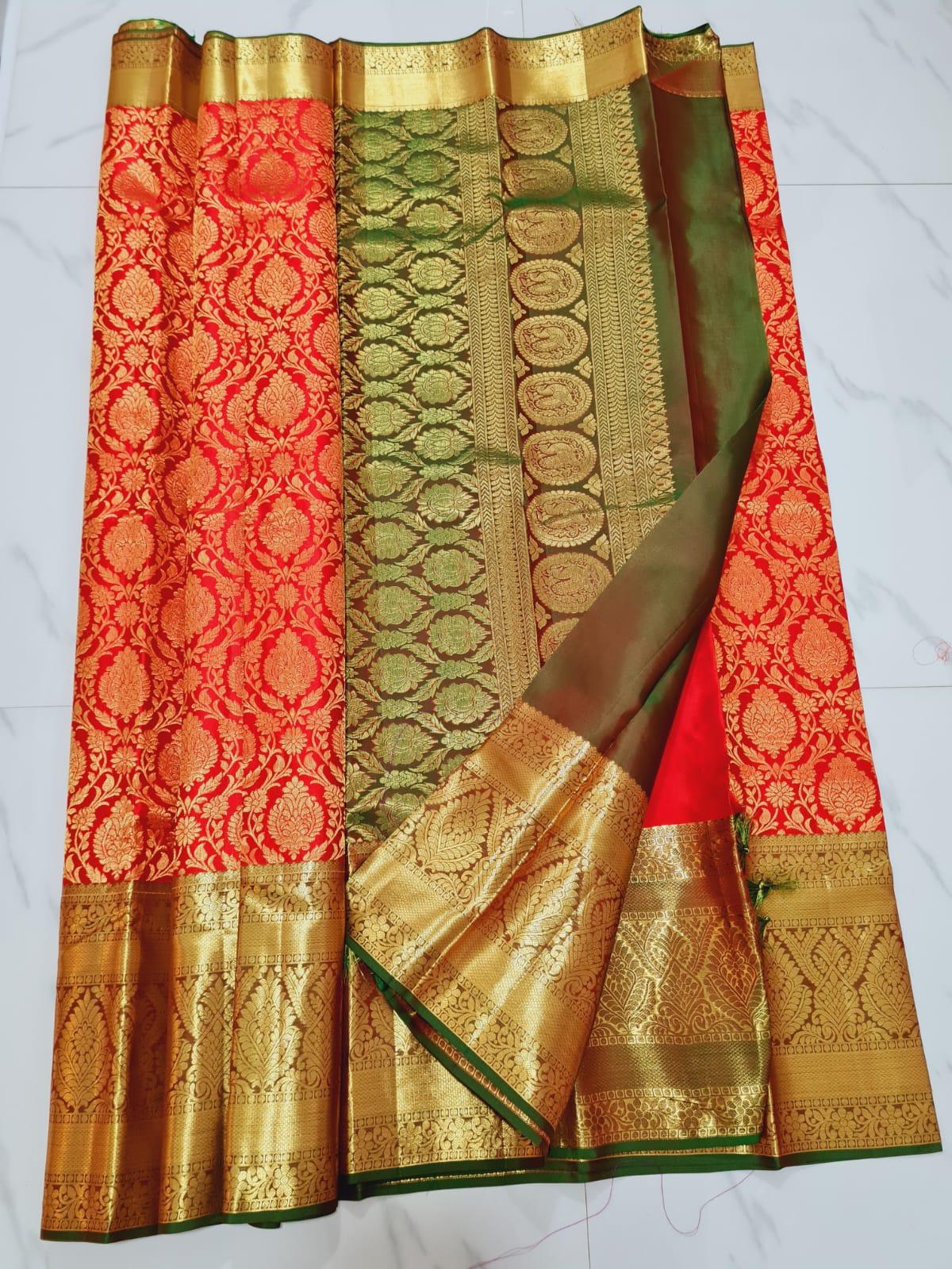 The vibrant red body symbolizes auspiciousness and prosperity, while the contrasting green border and pallu enhance its classic appeal. Intricate gold zari motifs and a richly woven pallu add a regal touch, making this saree an ideal choice for weddings, bridal ceremonies, and festive celebrations. Designed to drape beautifully and last for generations, it is a true heirloom piece.