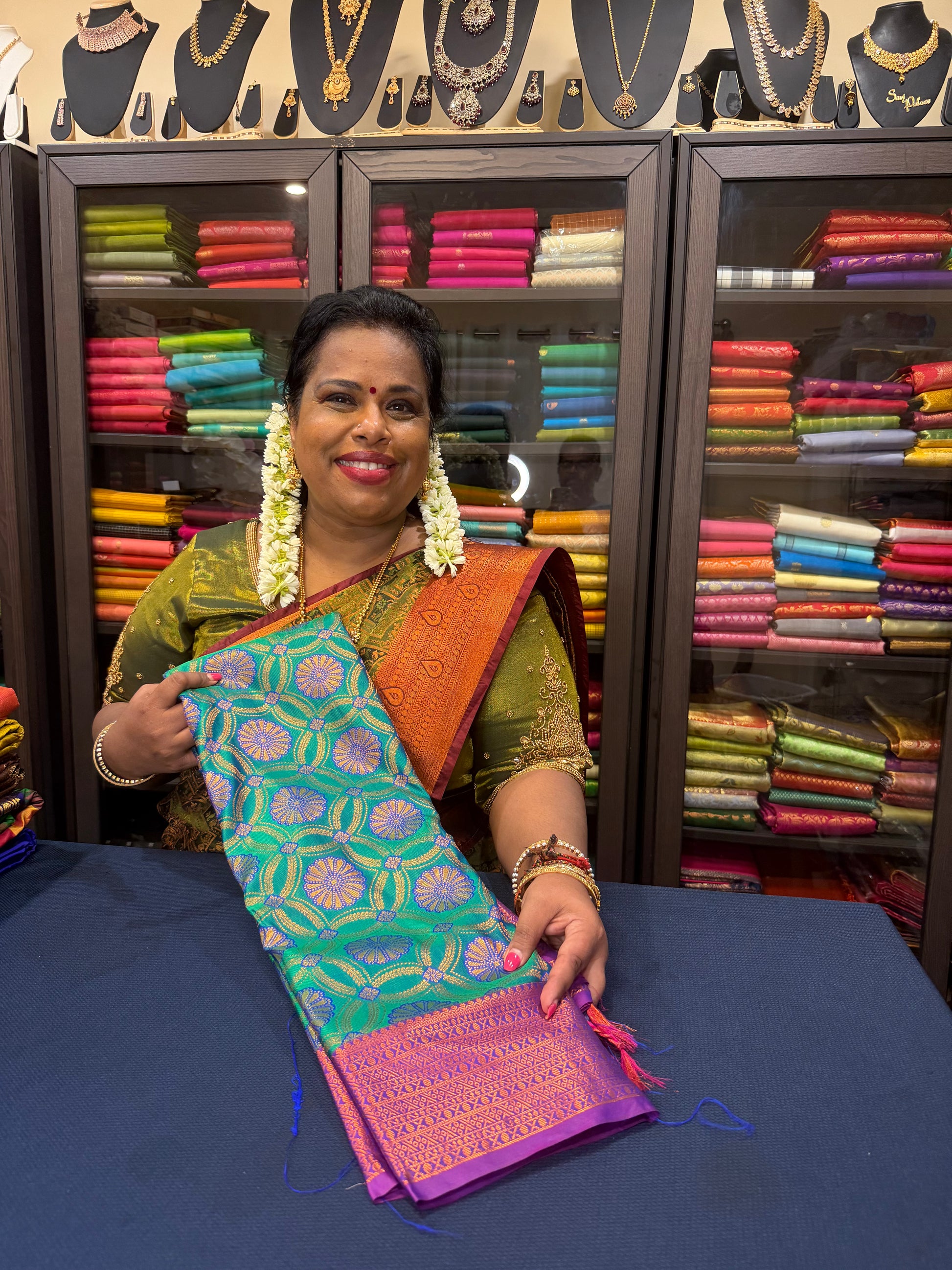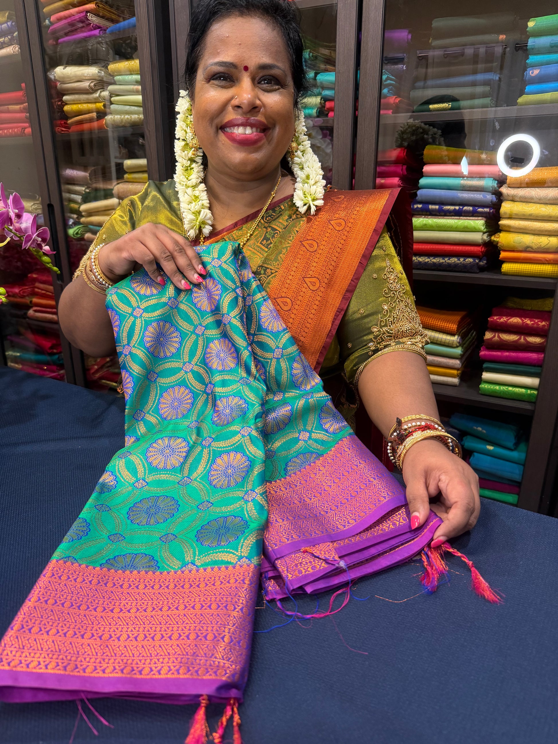 Say hello to elegance with our gorgeous Peacock’s neck colour Green and Magenta Purple Bridal Kanchipuram! 🌟 This superior quality semisilk sari features stunning copper Jari work that adds a touch of sparkle to your special day. ✨ The intricate details on the magenta border and pallu make it absolutely mesmerizing!