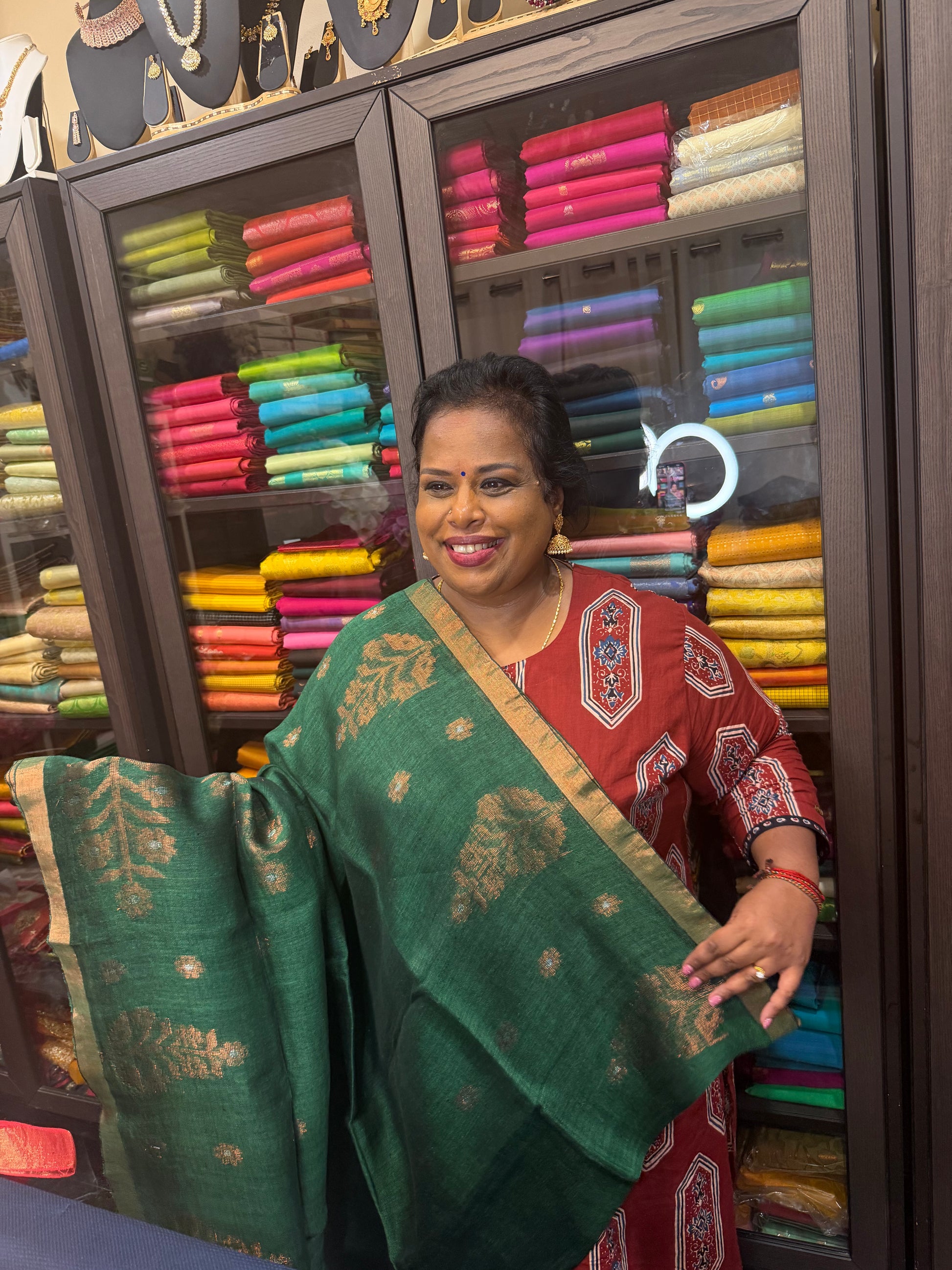 This listing is for the Green sari shown on the first photograph. Photos of other colours have been included to show how the sari looks like.
