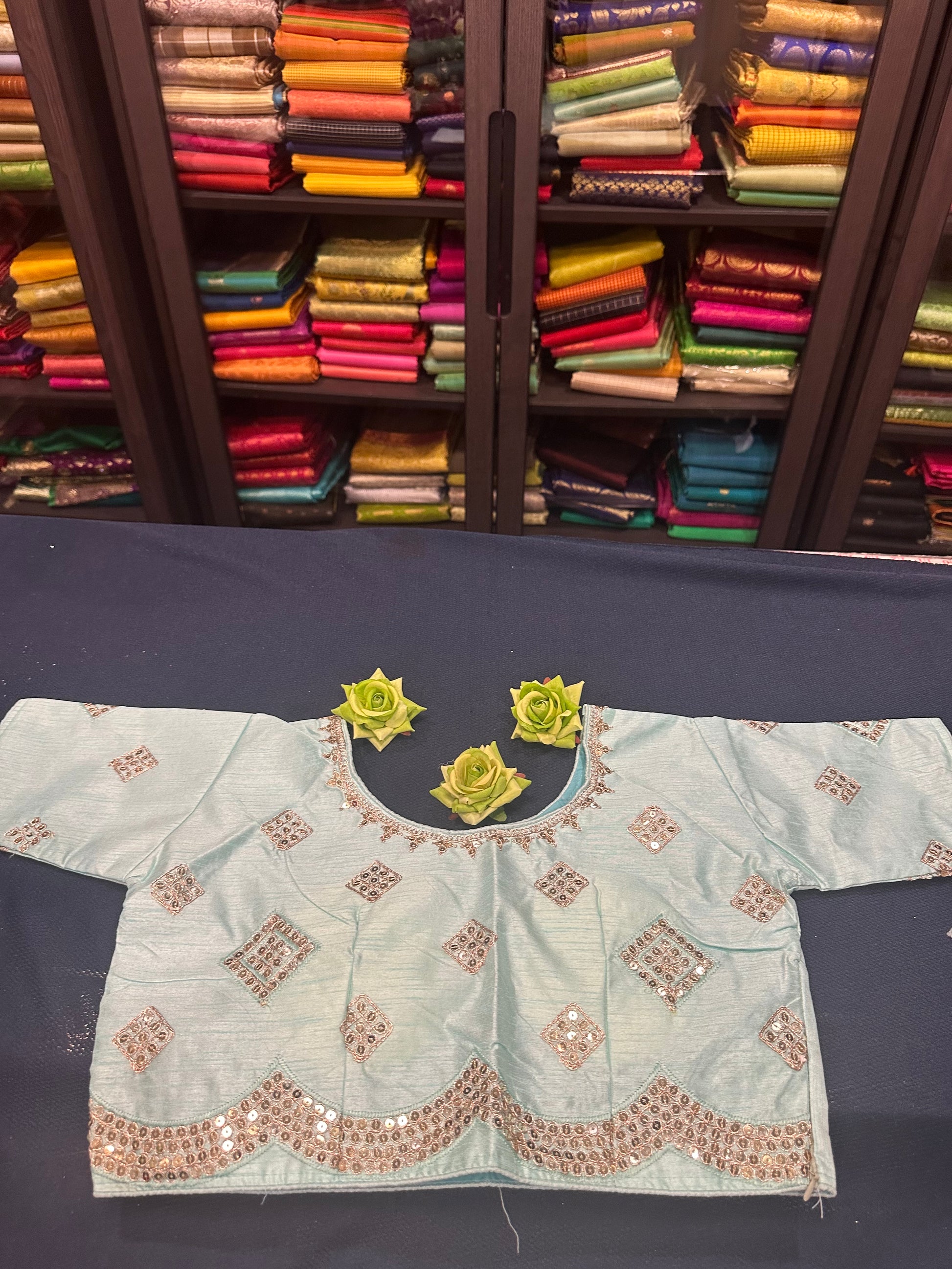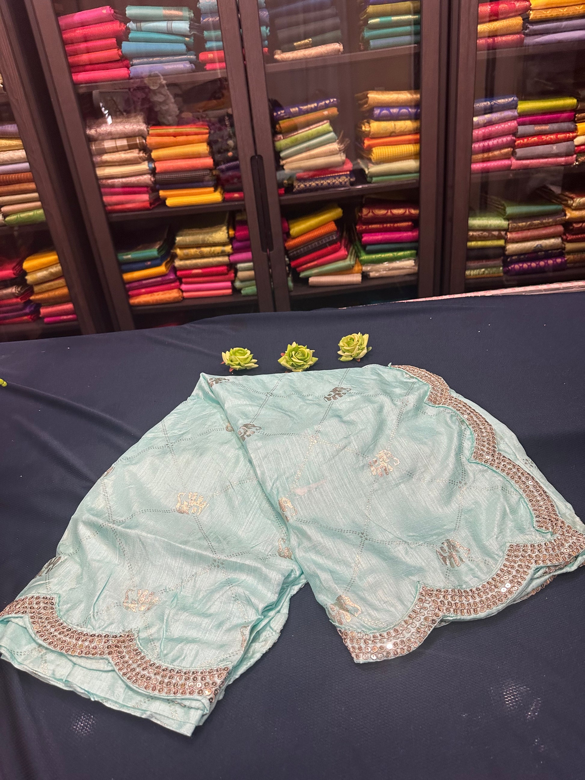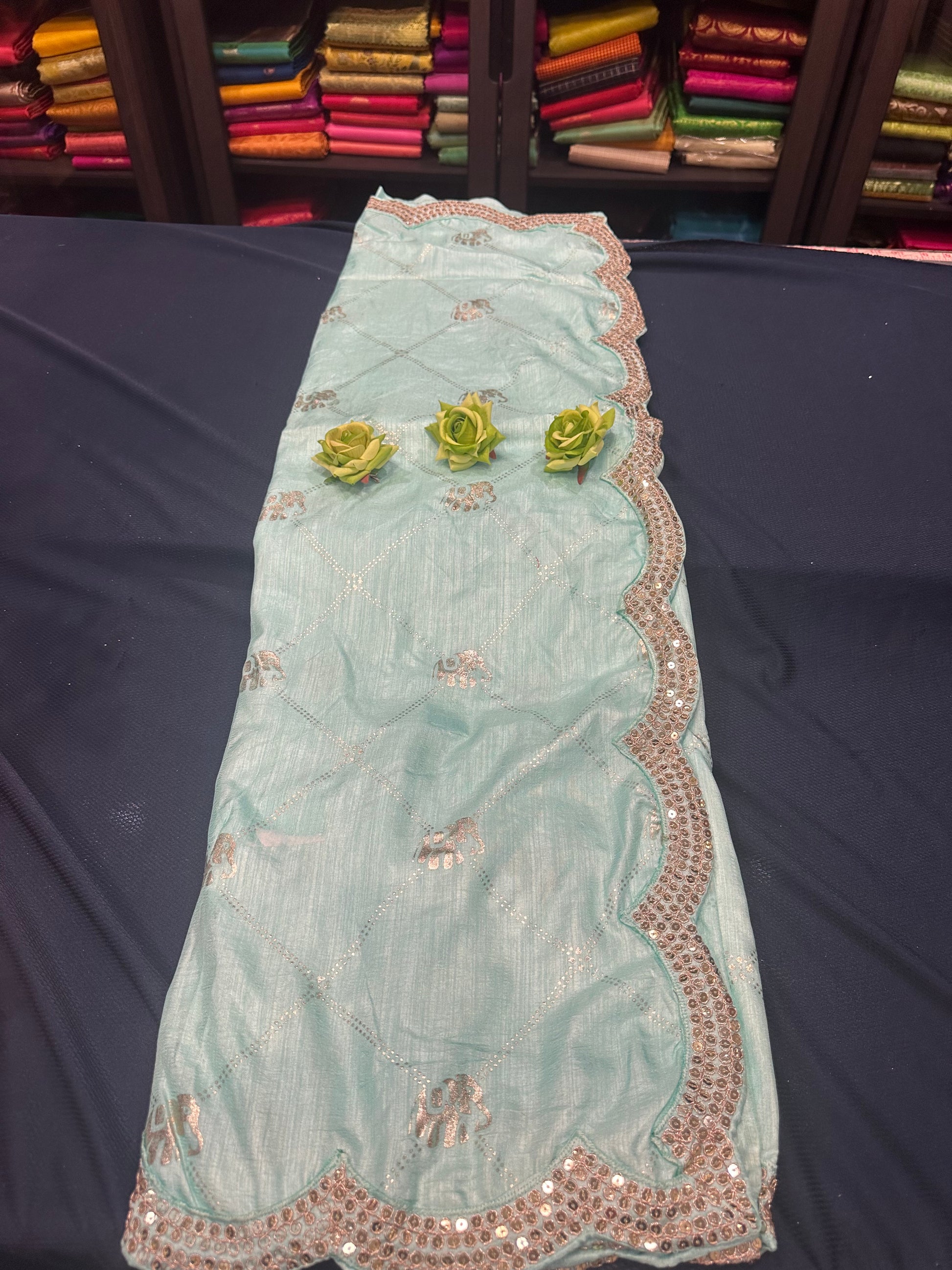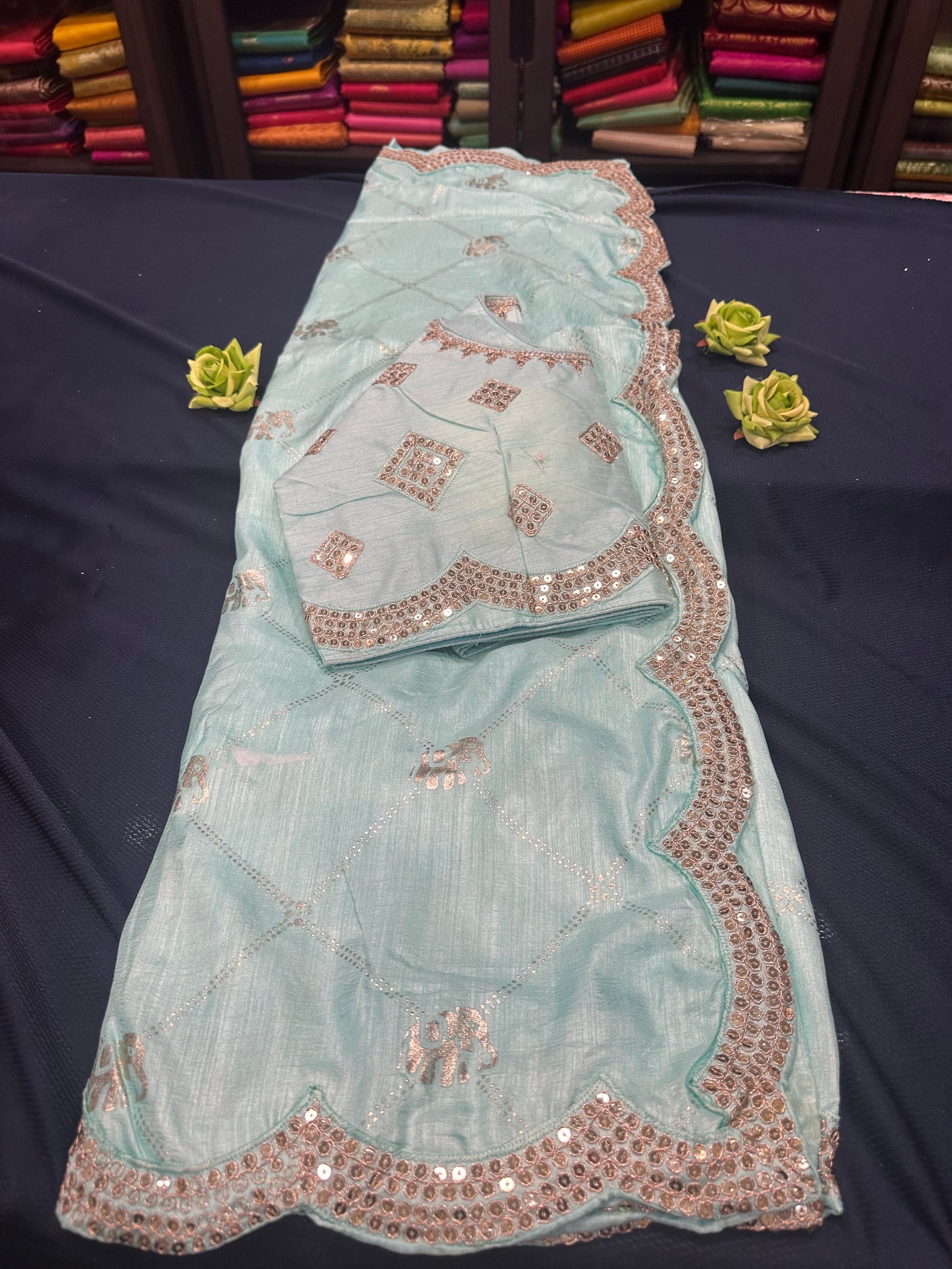 This is a Sky Blue saree featuring all-over simple sequin work, a matching readymade blouse, and a scalloped, cut-work border with metallic embroidery. The fabric is a lightweight material.