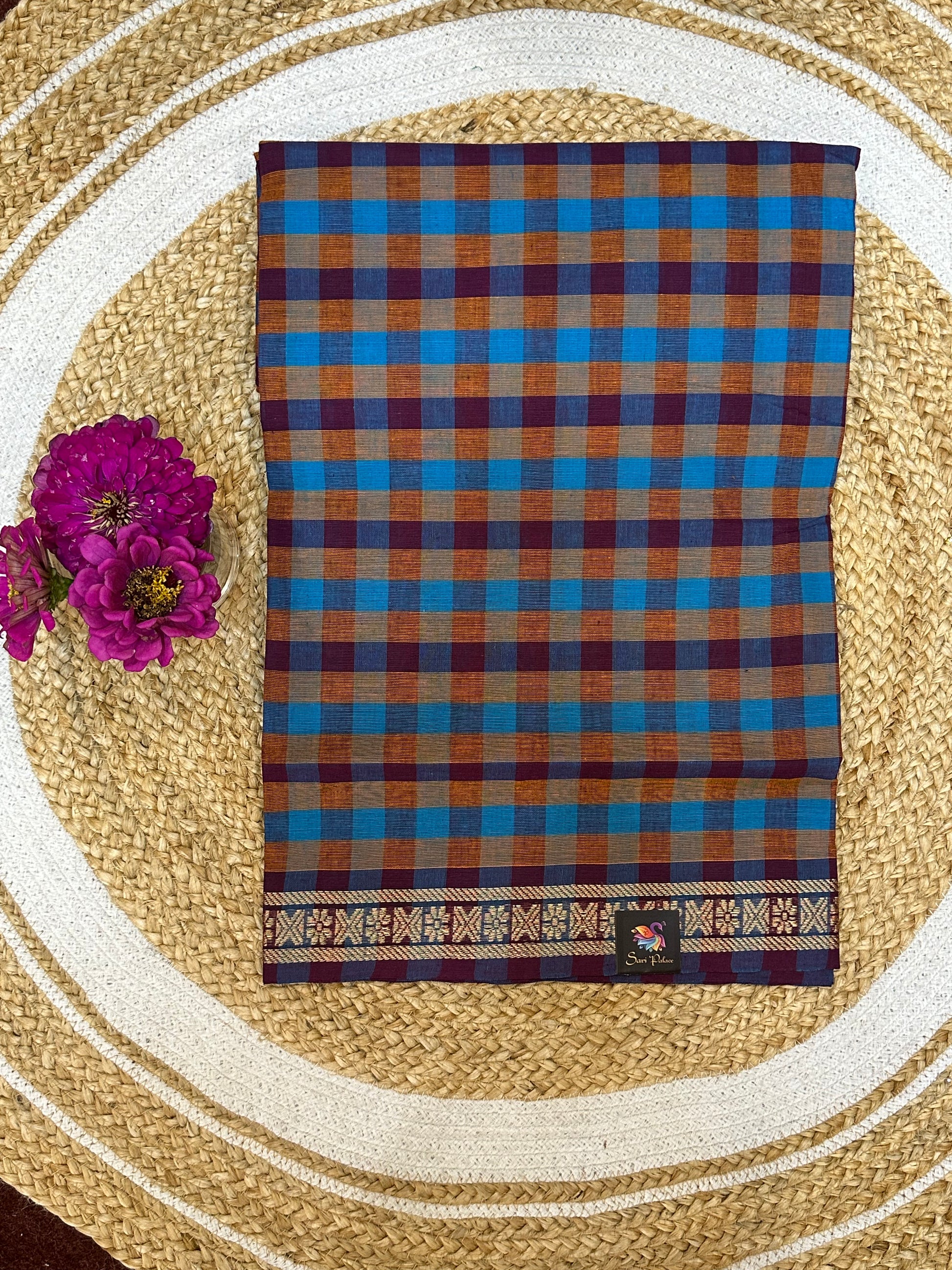 This item is a Chettinad cotton saree featuring a vibrant checked pattern with a traditional gold zari border. These sarees, also known as Kandangi or Sungudi sarees, are handwoven in Tamil Nadu, India, and are renowned for their bold colors and geometric designs.
