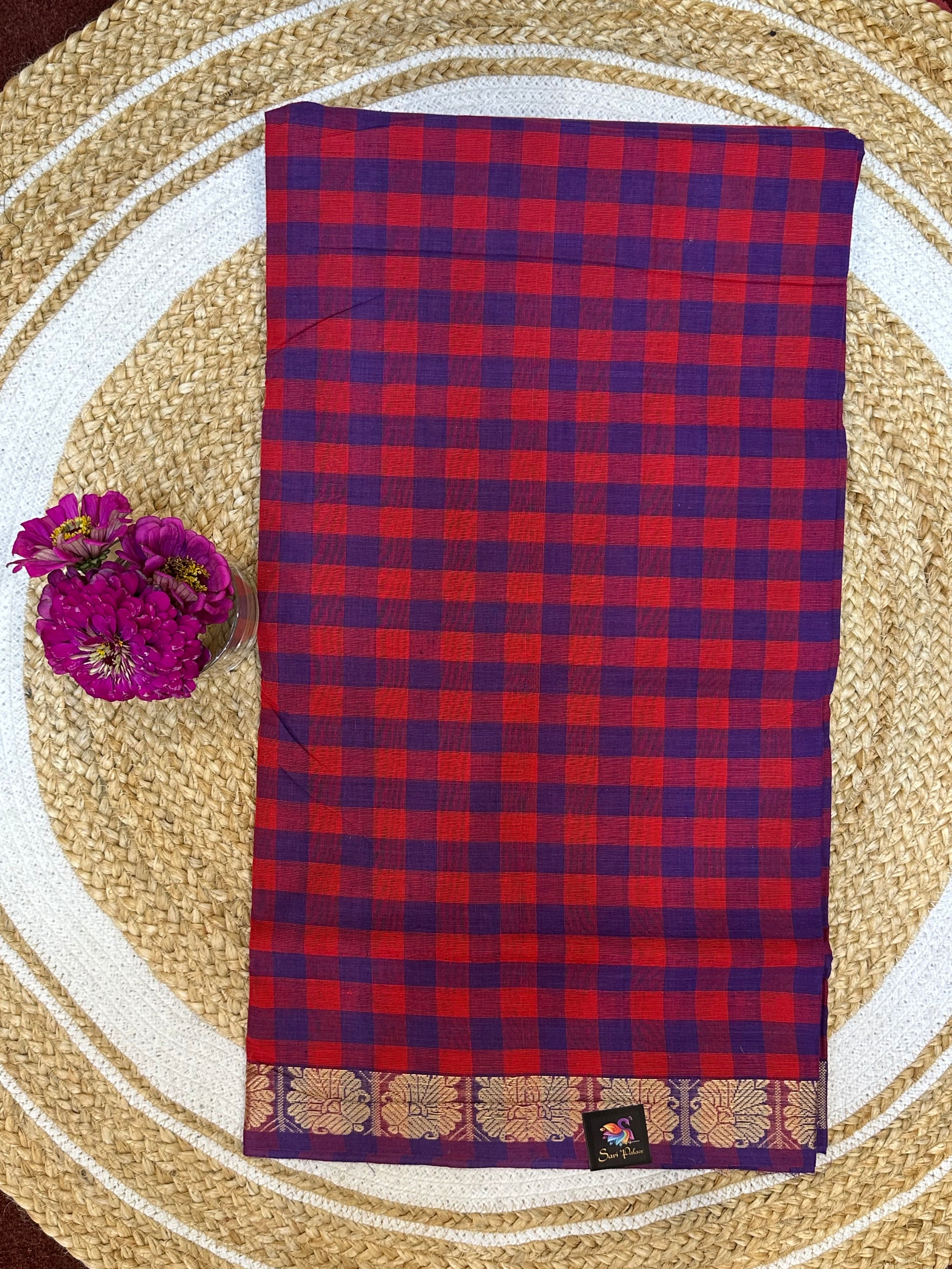 This item is a Chettinad cotton saree featuring a vibrant checked pattern with a traditional gold zari border. These sarees, also known as Kandangi or Sungudi sarees, are handwoven in Tamil Nadu, India, and are renowned for their bold colors and geometric designs.