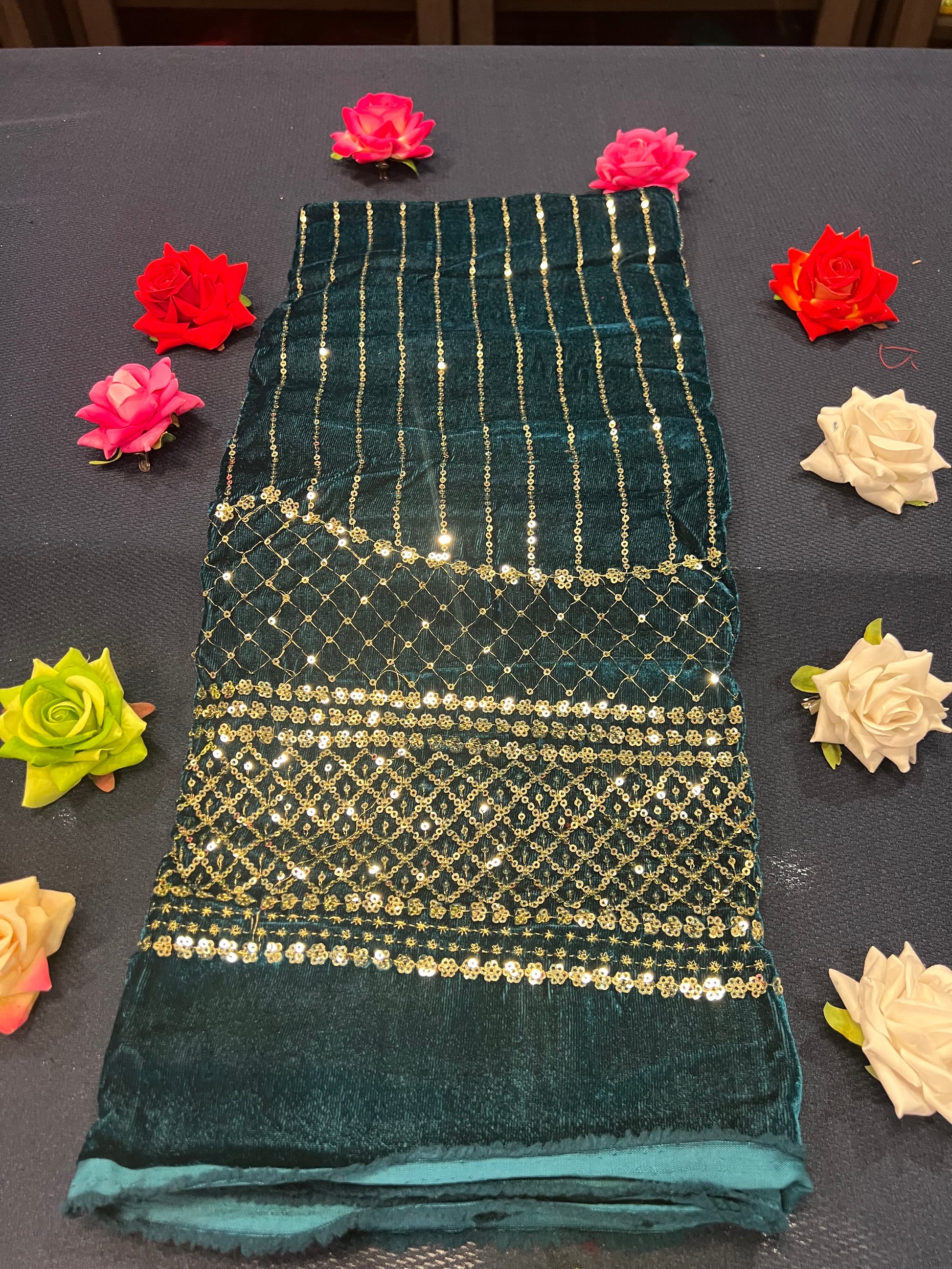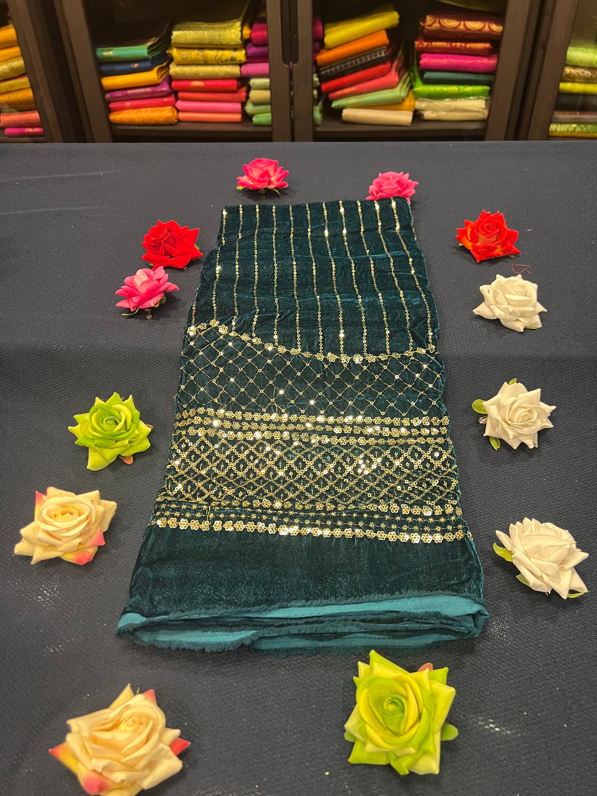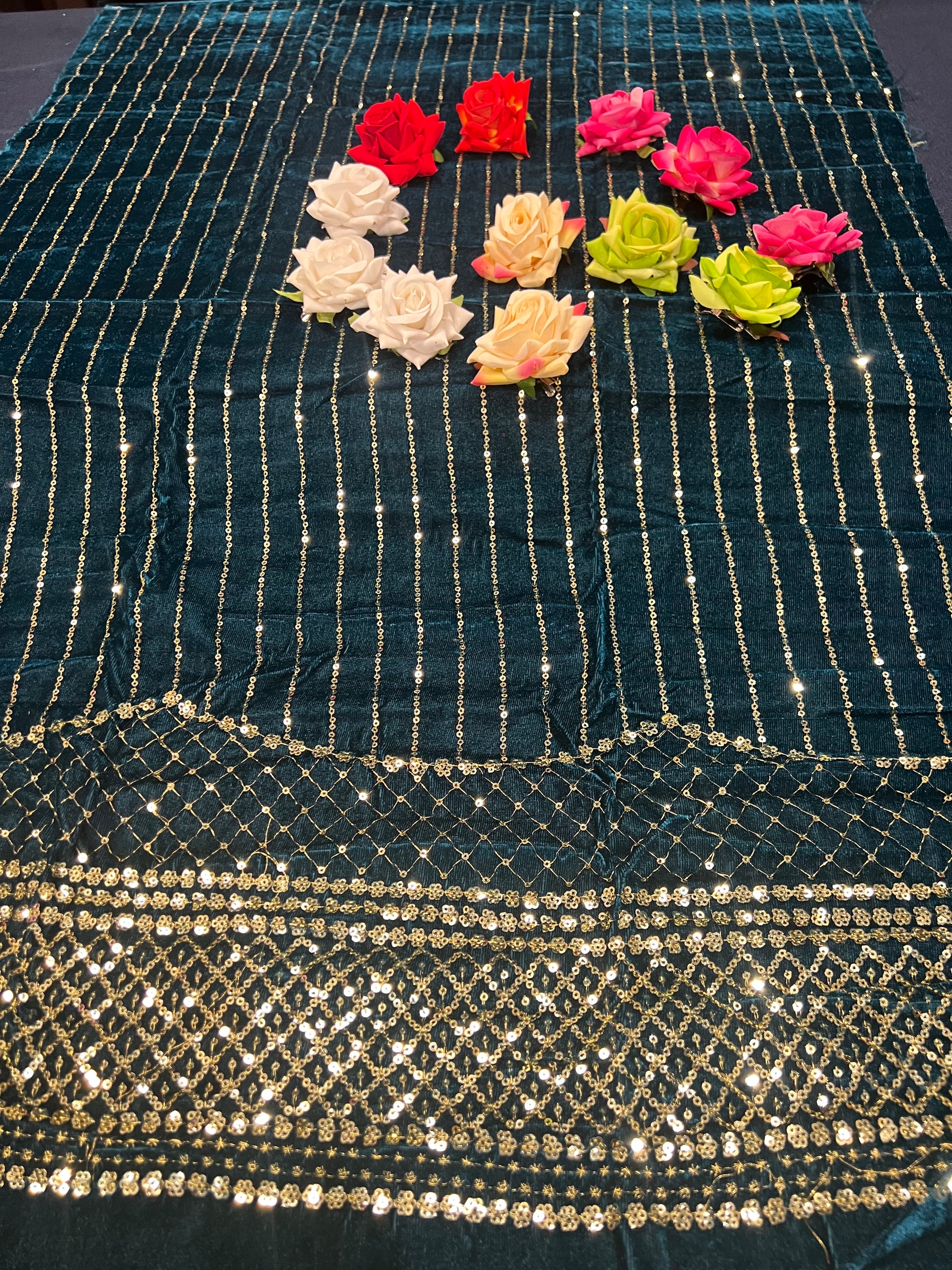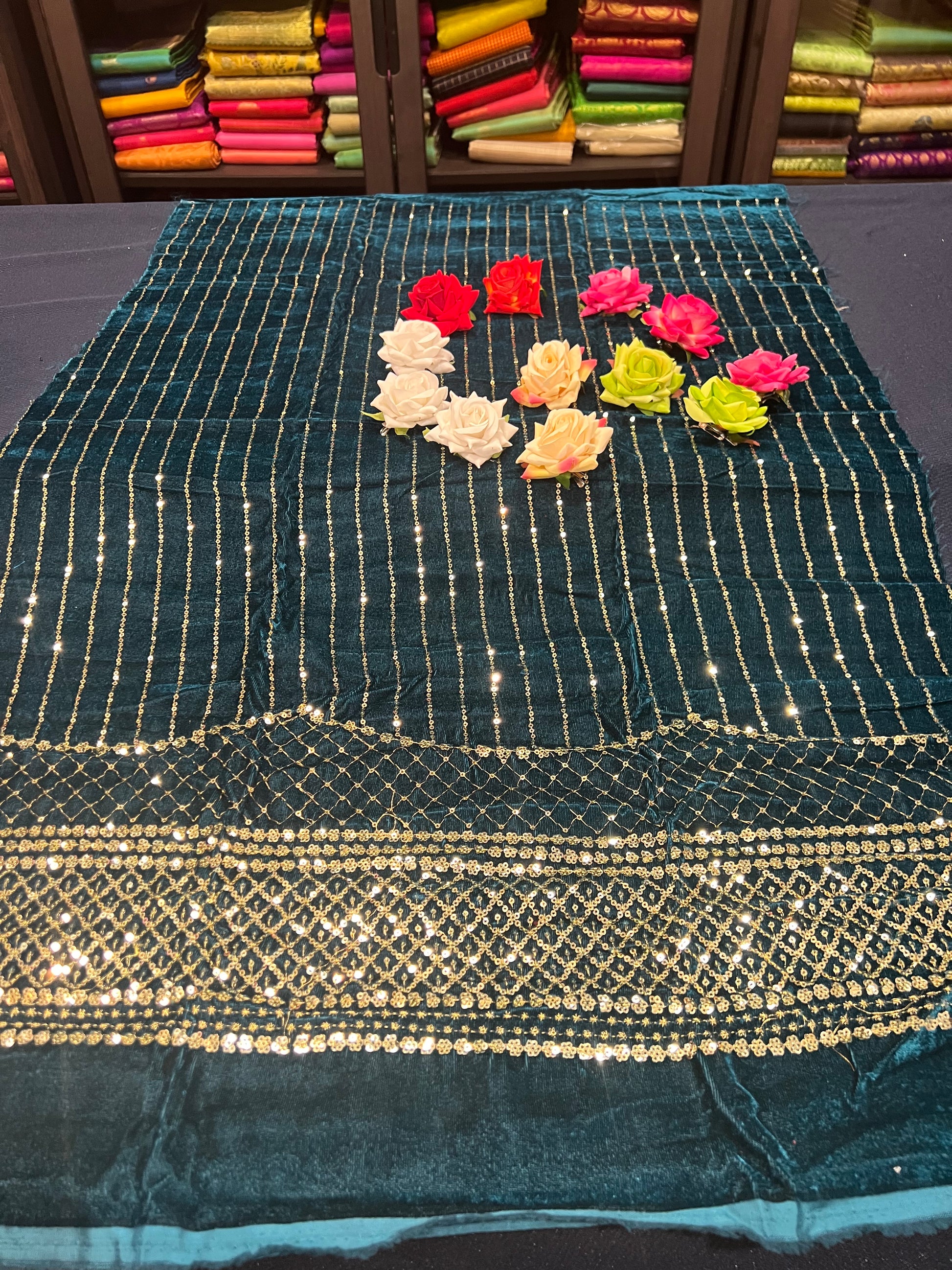 🌟✨ Elevate your wardrobe with our stunning Tearl Blue/ Green Velvet Blouse Material! 🌿💚 This gorgeous 1-meter piece features exquisite gold sequins and intricate embroidery work, making it a must-have for any fashionista.